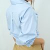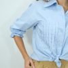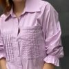 Blusa de popelina de manga media y detalles de bolsillos corrugados en la parte del busto. Disponible en color azul y lila.