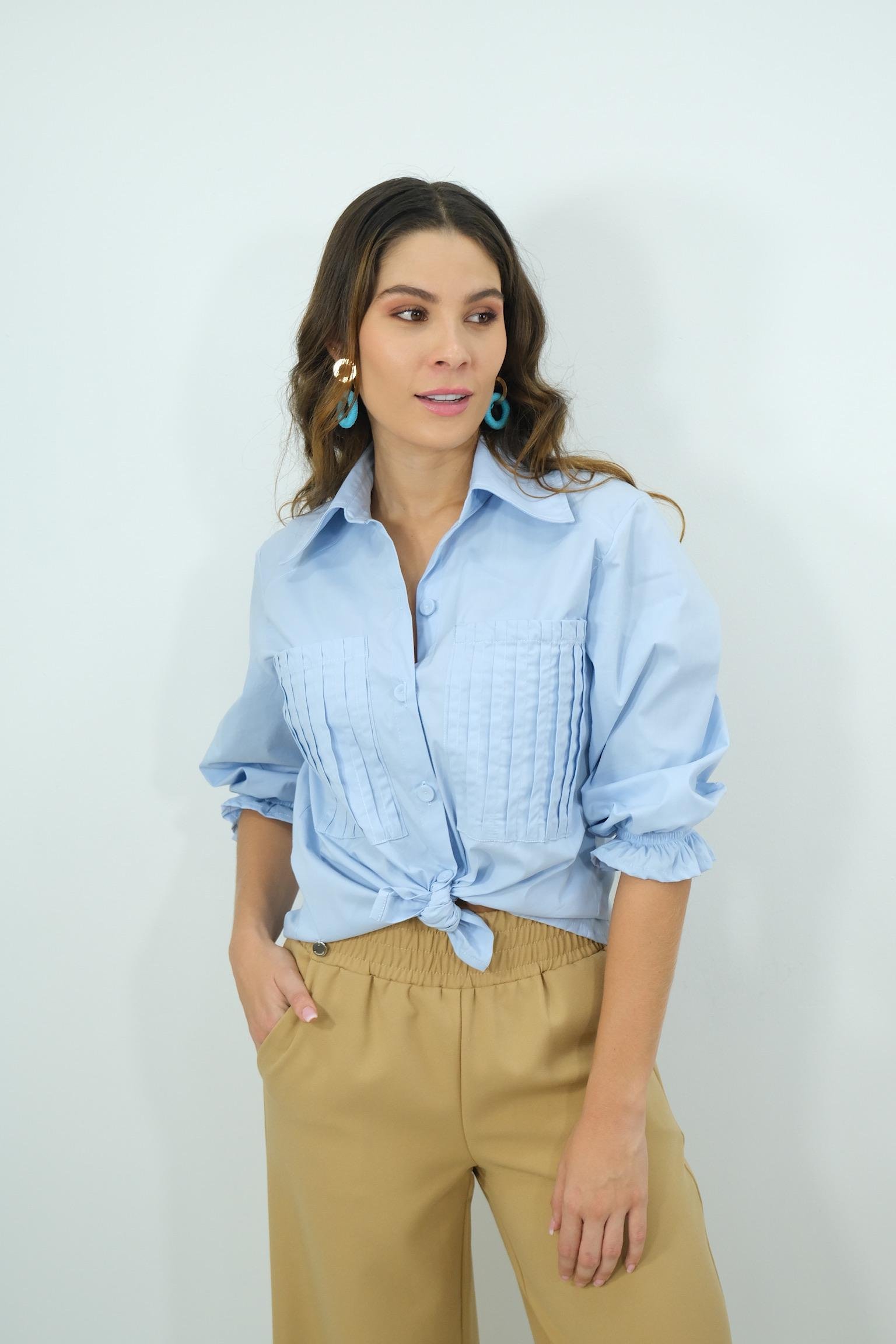 Blusa de popelina de manga media y detalles de bolsillos corrugados en la parte del busto. Disponible en color azul y lila.