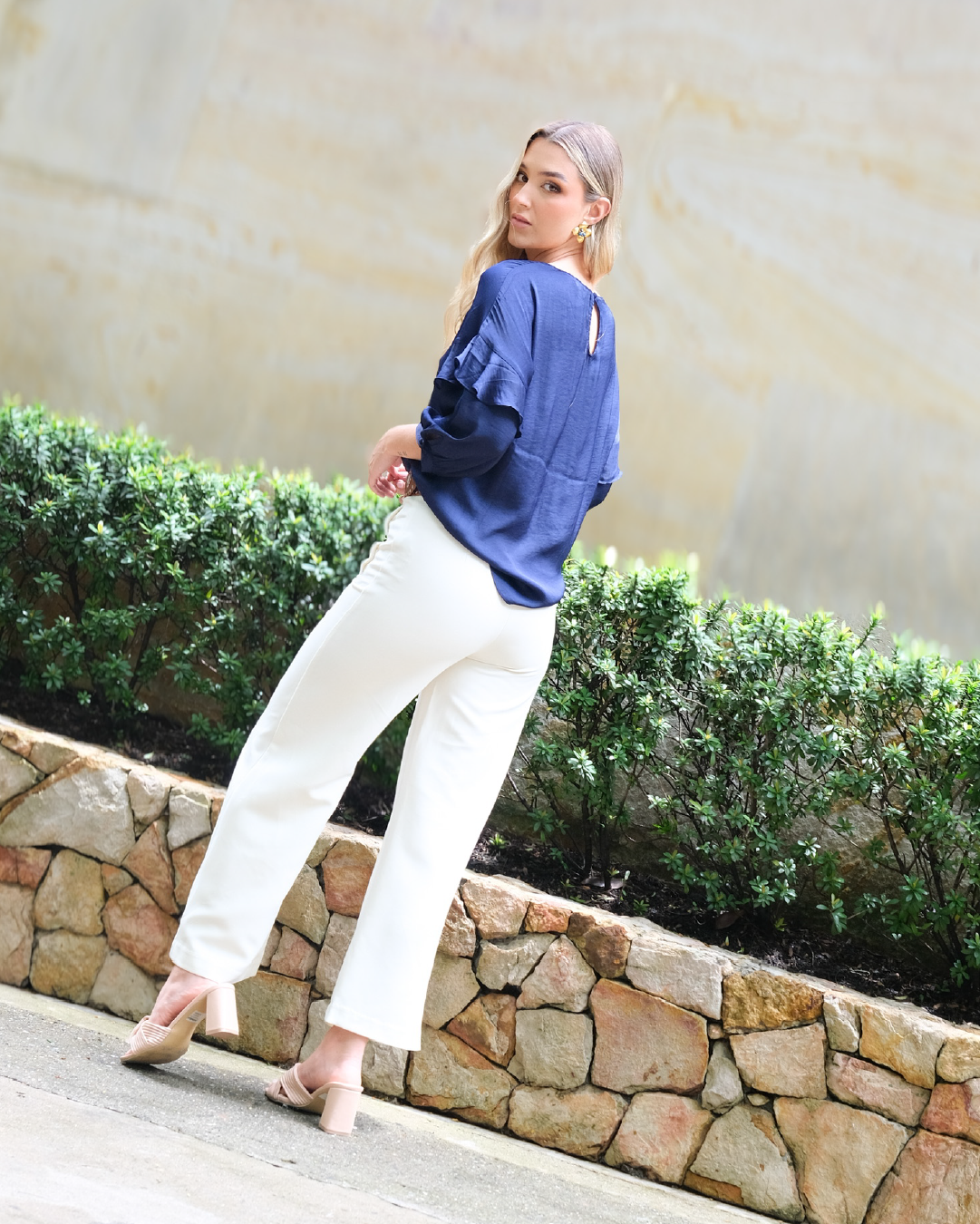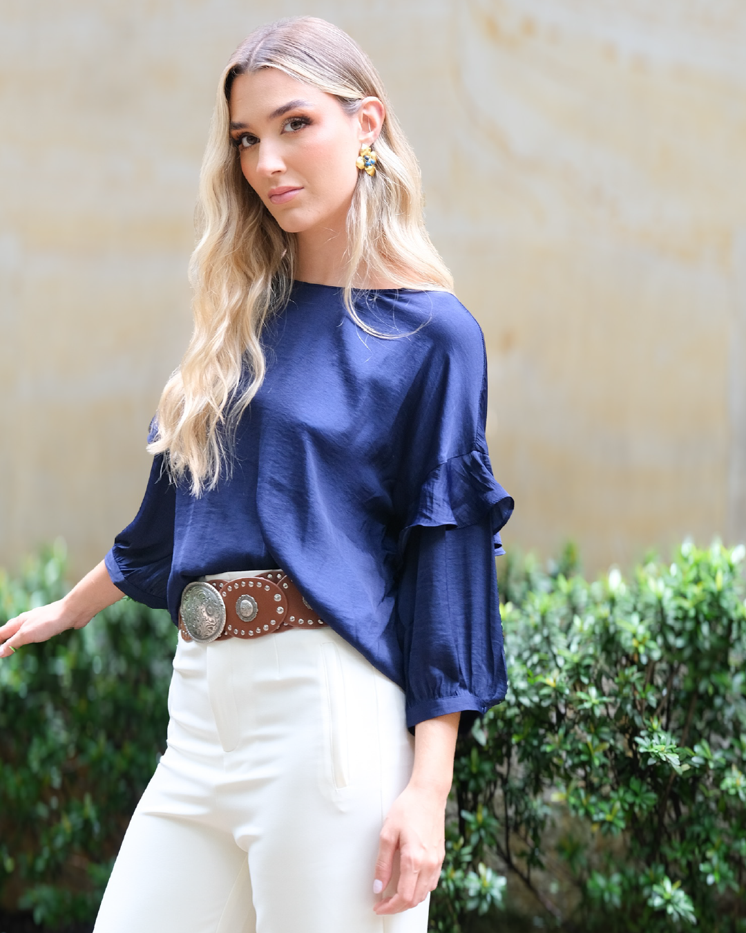 Descubre la elegancia atemporal con nuestra blusa azul marino, diseñada para realzar tu estilo en cualquier ocasión. Combinada con pantalones blancos, esta prenda ofrece un contraste sofisticado que resalta la frescura de tu look.