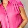 Blusa tipo seda de botones con cuello en V, manga corta con tirantes ajustables en manga y parte inferior.