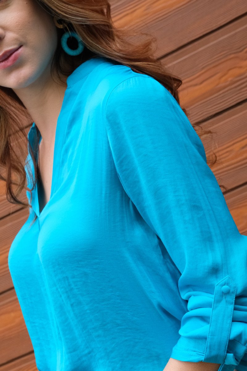 Blusa de mangas tipo seda con escote en V disponible en talla S, M Y L.