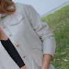 Chaqueta de lino con detalles de botones dorados y bolsillos en la parte frontal.