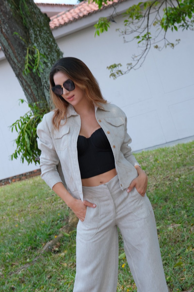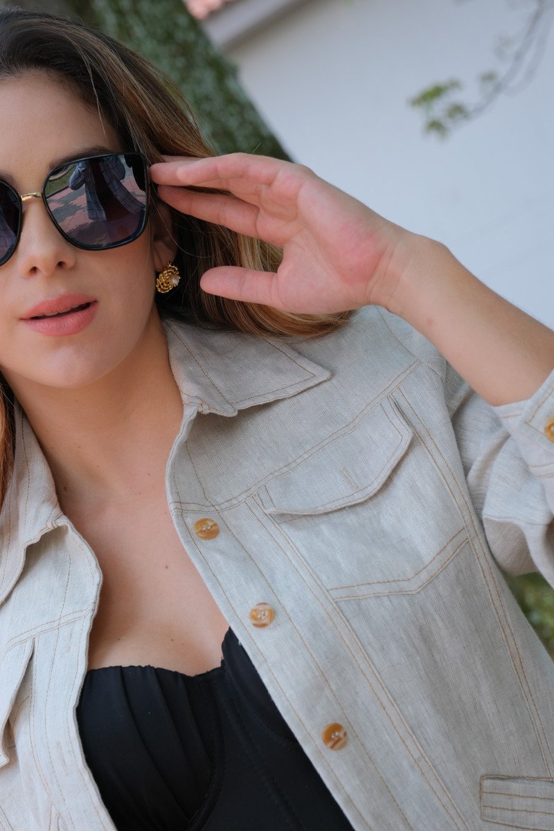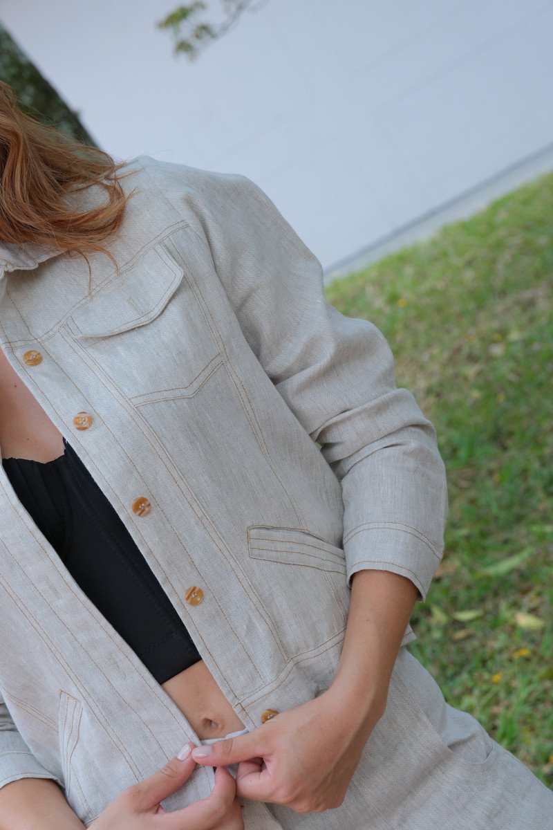 Chaqueta de lino con detalles de botones dorados y bolsillos en la parte frontal.