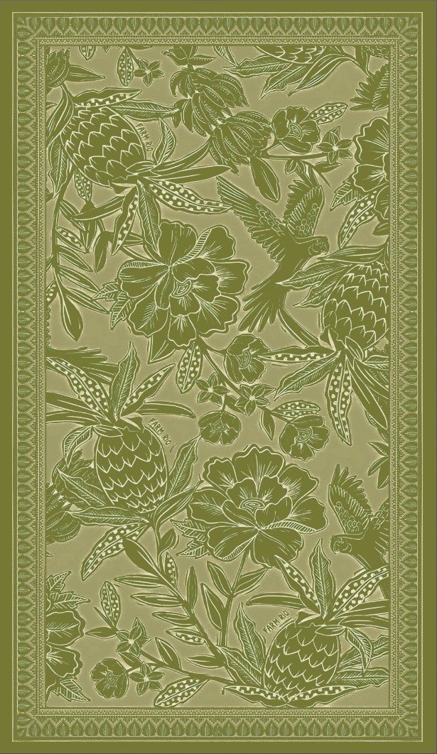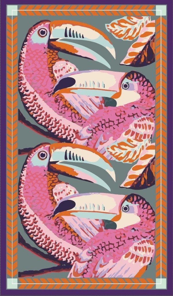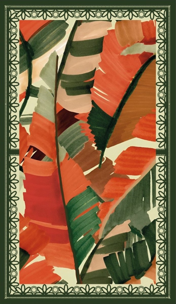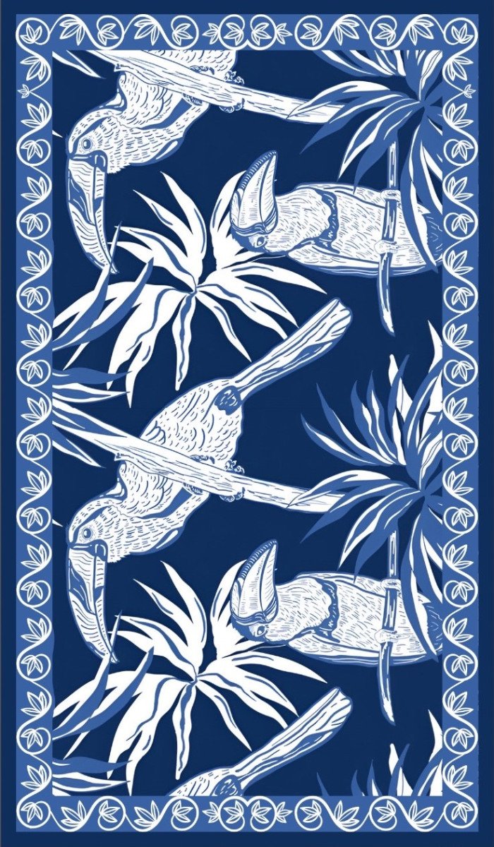 | Color | Azul print tucanes blancos, Blanco print palmeras negras, Mocca print palmeras beige, naranja print tucanes rosados, verde olivo print flores, verde print hojas naranja |