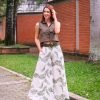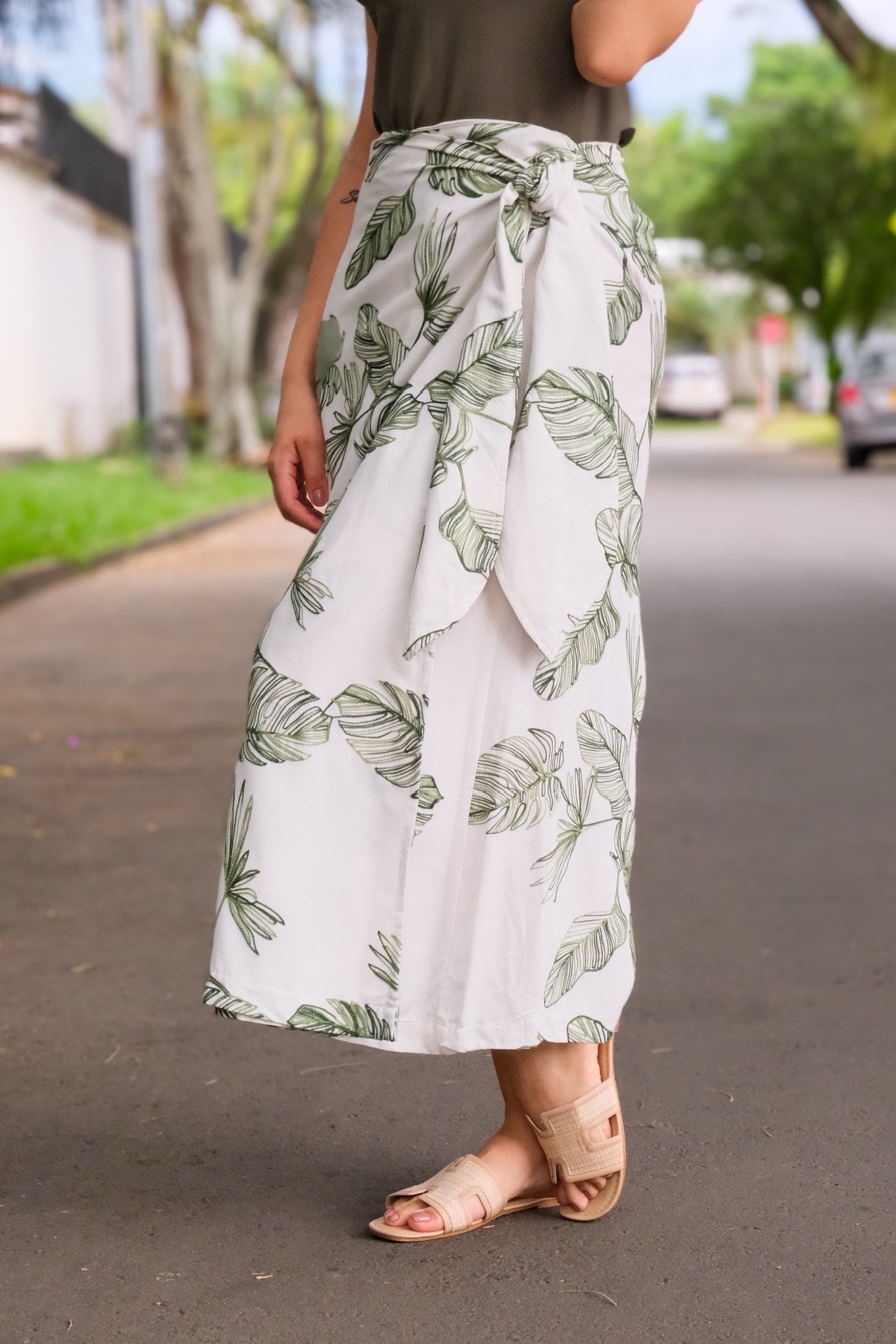 Pantalón tipo palazzo con resorte en la cintura, bordado en hojas verdes. Fresco, cómodo y de caída elegante, ideal para usar en el trabajo o en un almuerzo especial. Confeccionado en una mezcla de algodón y lino, aporta un toque de sofisticación sin perder comodidad.