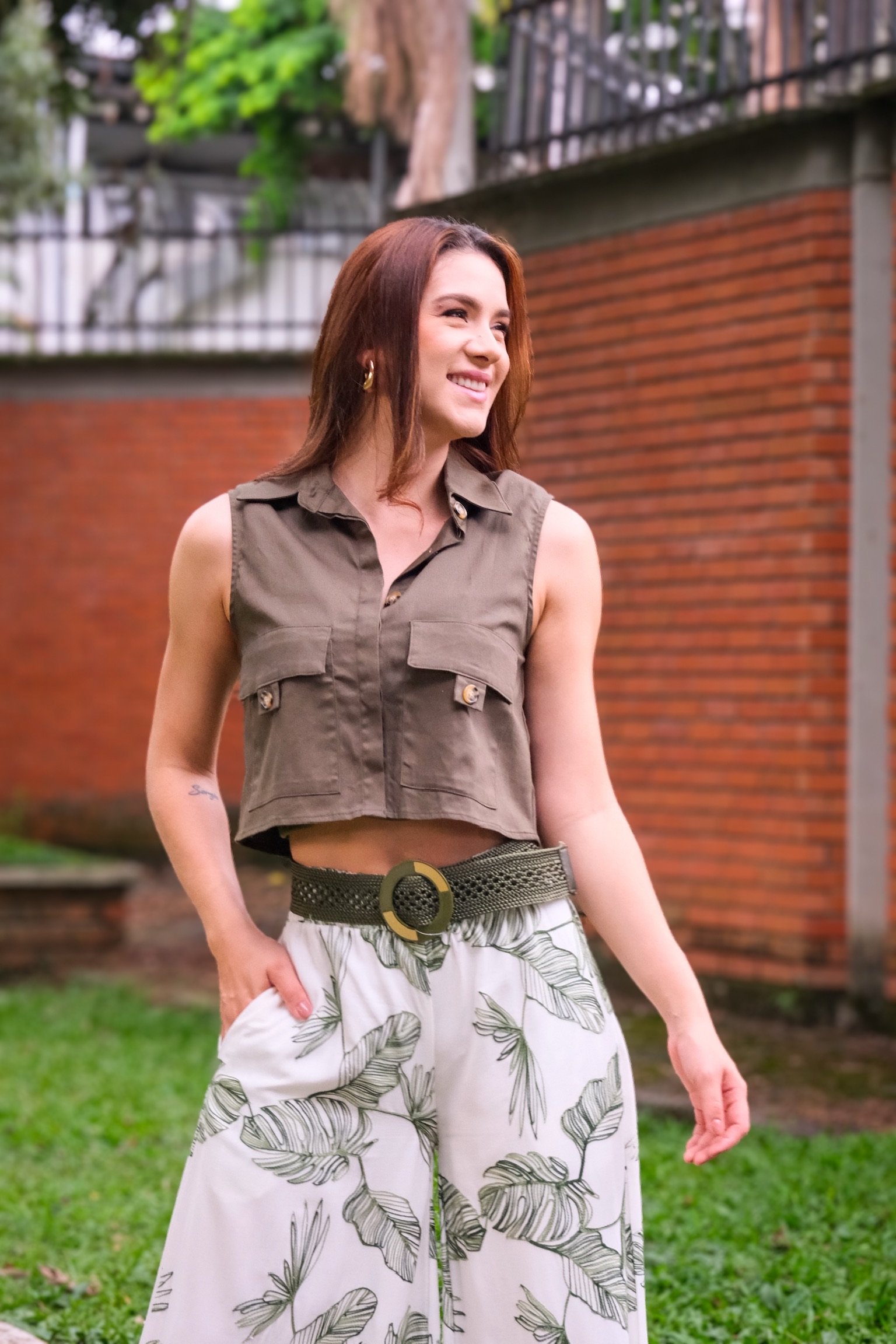Pantalón tipo palazzo con resorte en la cintura, bordado en hojas verdes. Fresco, cómodo y de caída elegante, ideal para usar en el trabajo o en un almuerzo especial. Confeccionado en una mezcla de algodón y lino, aporta un toque de sofisticación sin perder comodidad.