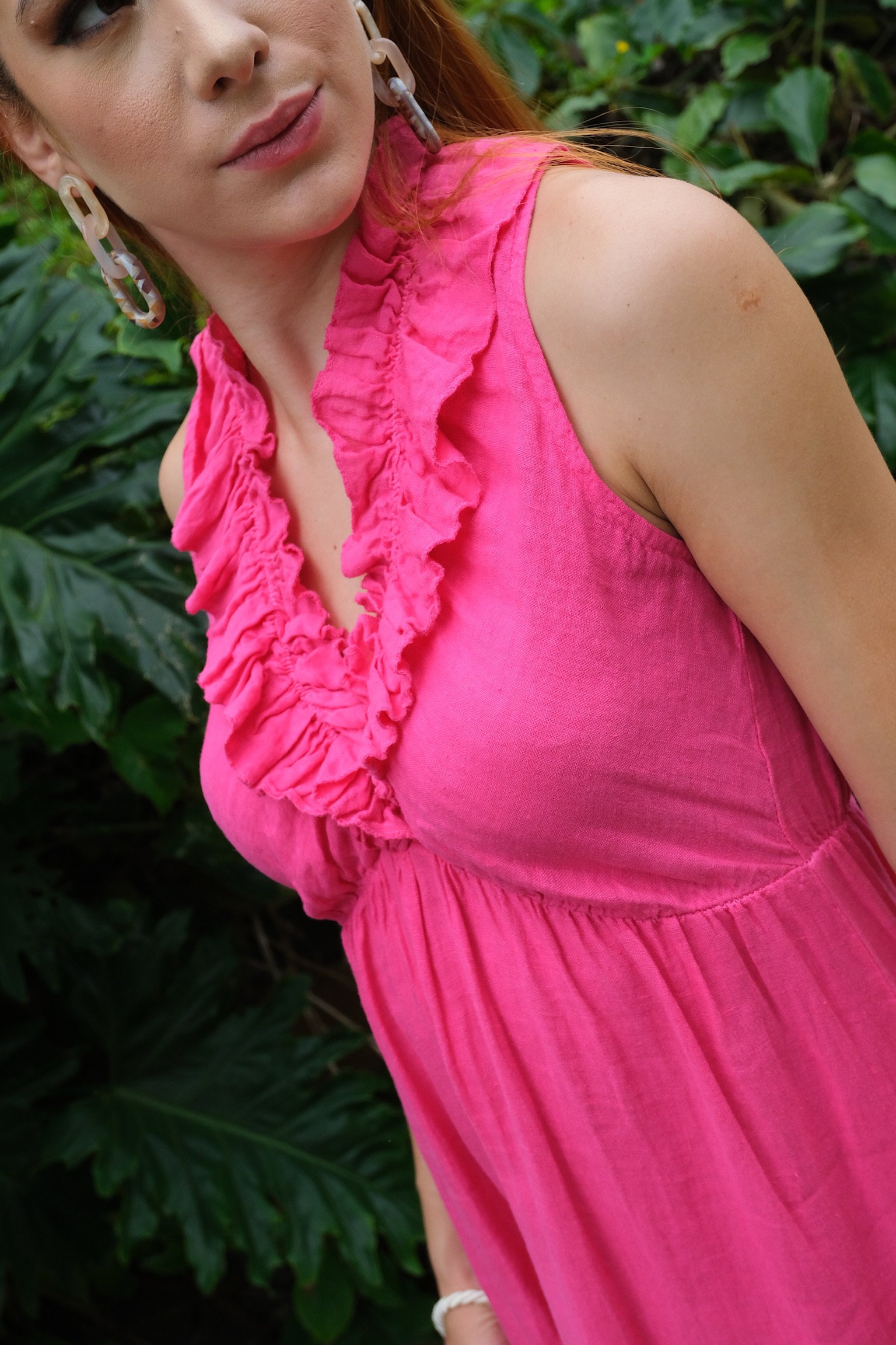 Vestido largo en lino, terminación en bolero en la parte inferior, y cuello en V. Fresco y versátil