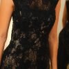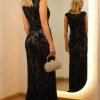 Vestido largo con cuello redondo y manga sisa con detalles de flores de encaje y perlas negras.