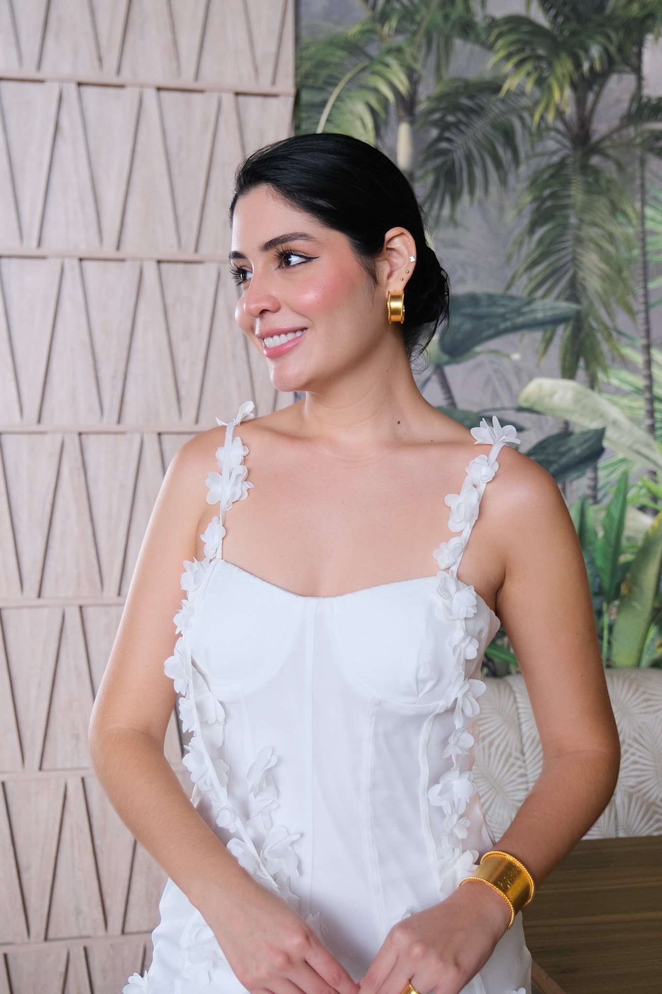 VESTIDO BLANCO MANFA SISA, TIRAS APLIQUES FLORES , CON FONDO