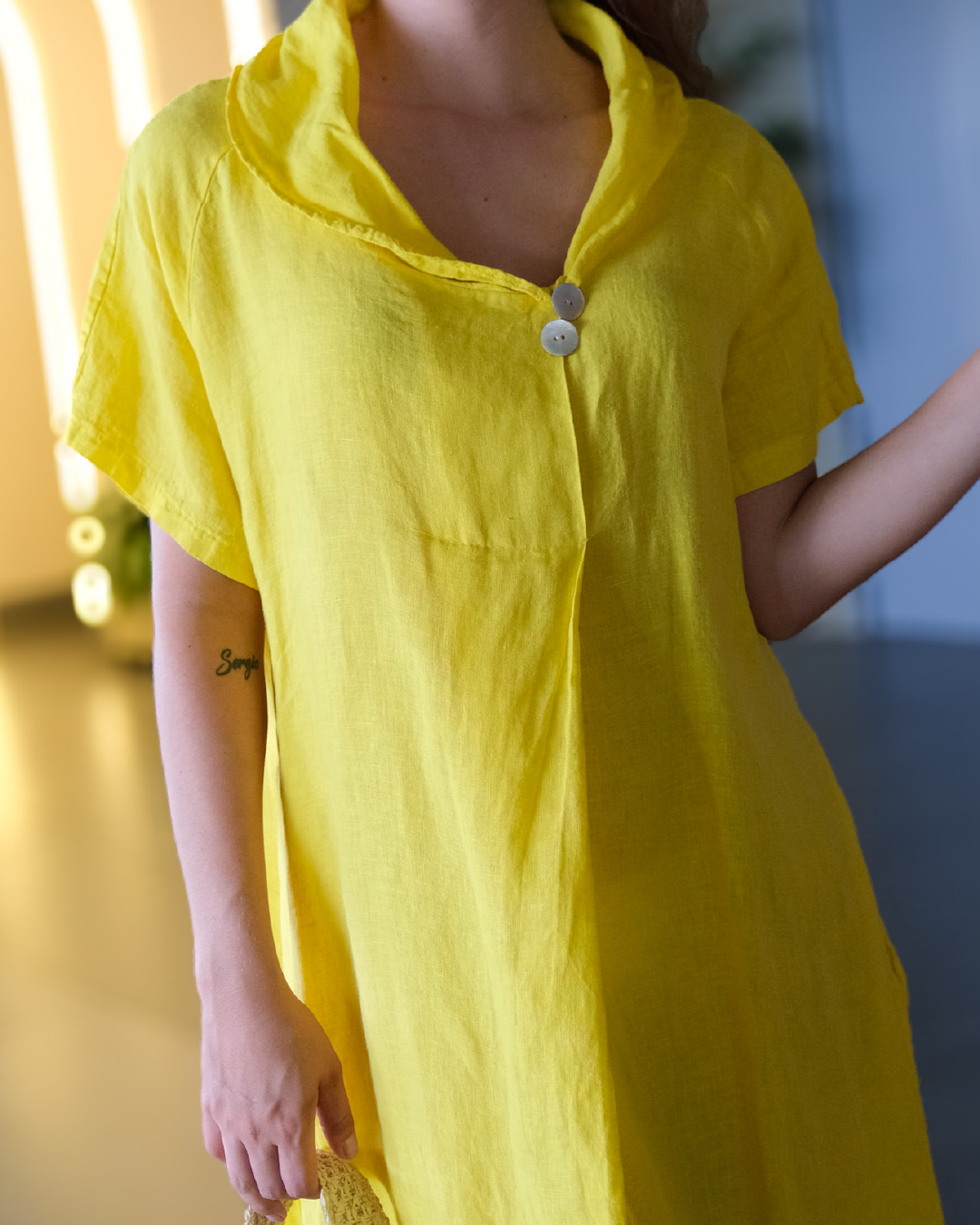 VESTIDO 100% LINO CUELLO BANDEJA UN BOTON ADELANTE, SILUETA AMPLIA, MANGA CORTA