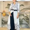 Vestido en viscosa y algodón de botones con cuello en corte V mangas largas y estampado tipo cebra en tonos grises.