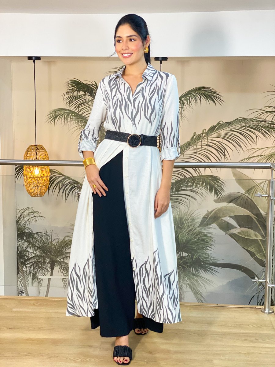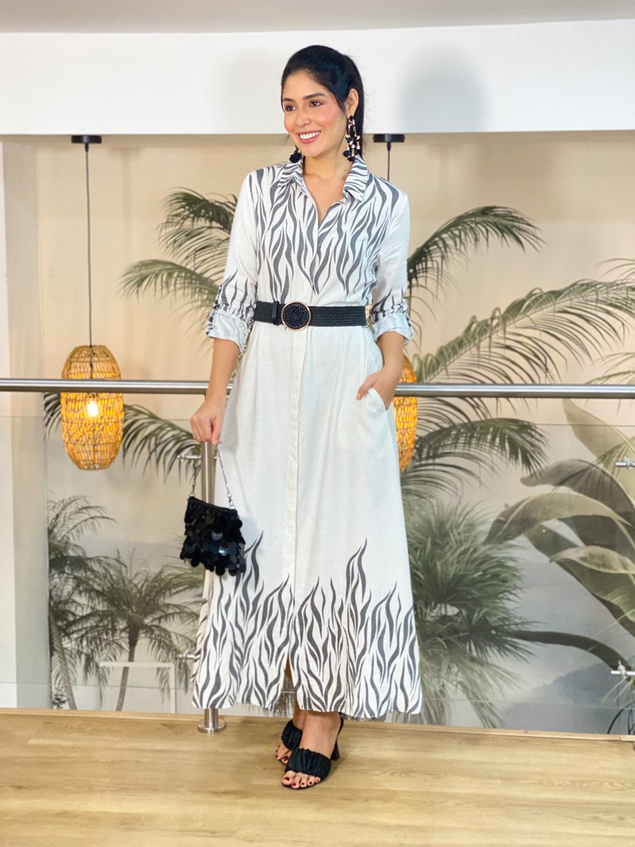 Vestido en viscosa y algodón de botones con cuello en corte V mangas largas y estampado tipo cebra en tonos grises.