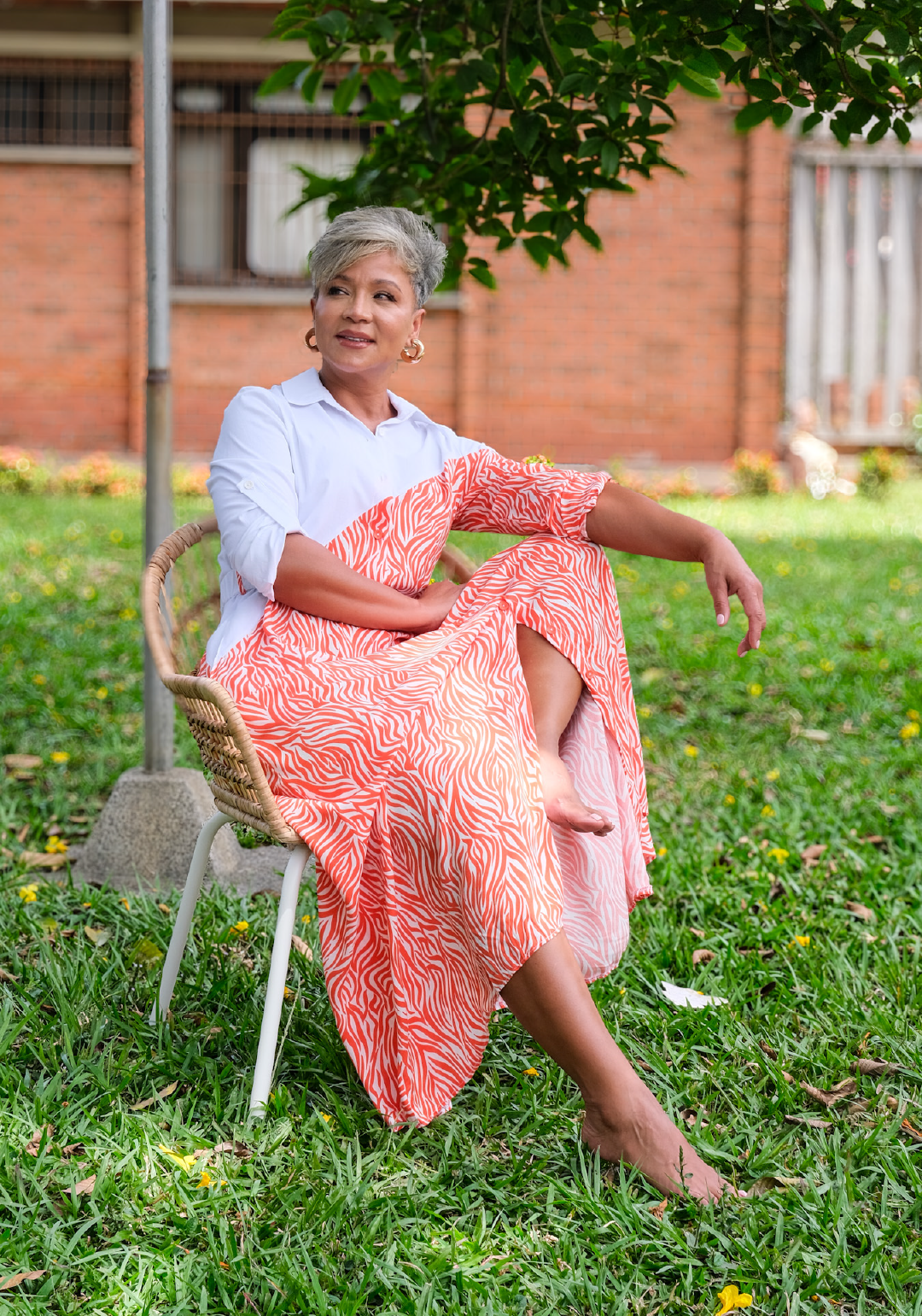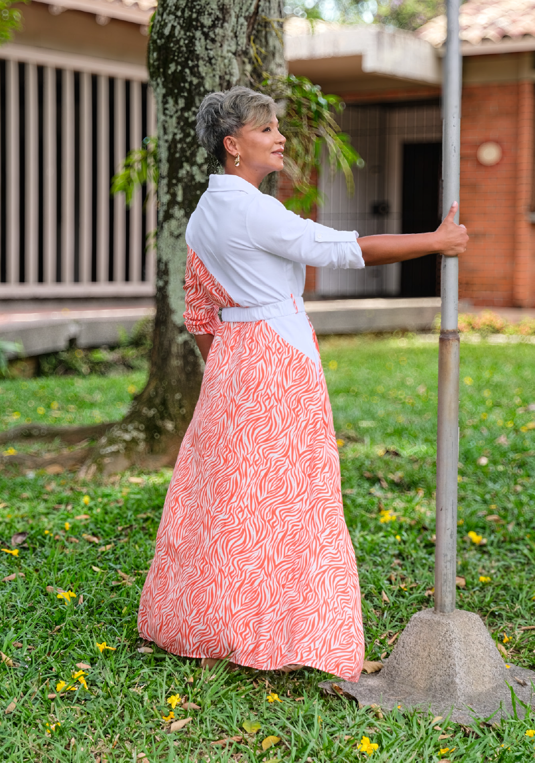 Vestido largo con diseño bicolor que combina un estampado animal print vibrante con detalles lisos en la parte superior. cuenta con cuello tipo camisa, mangas tres cuartos y cinturón que define la silueta. una prenda sofisticada y moderna, perfecta para destacar con elegancia en ocasiones especiales o eventos al aire libre.