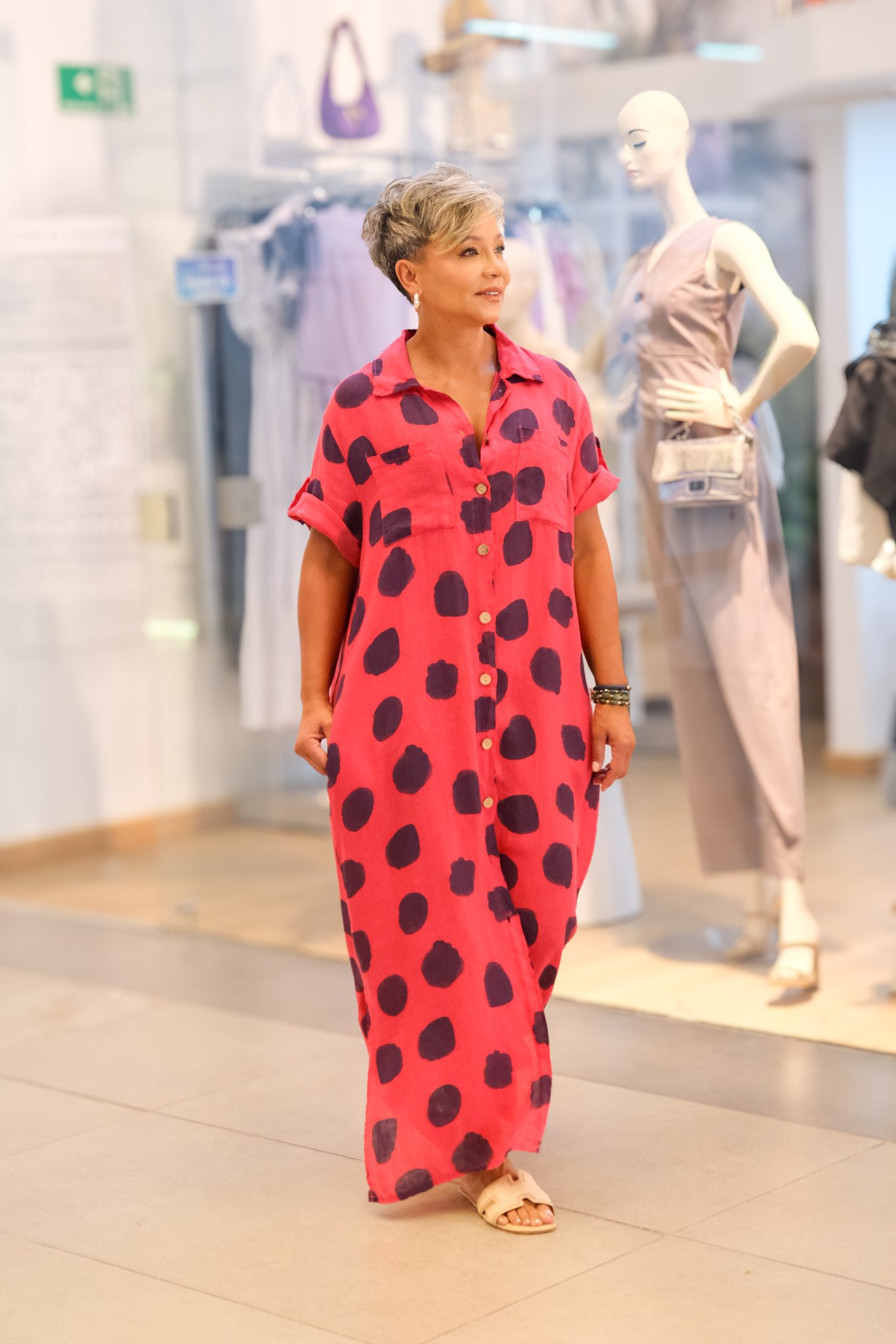Vestido de lino talla única de silueta amplia con print de hojas en la parte inferior y en borde de manga.