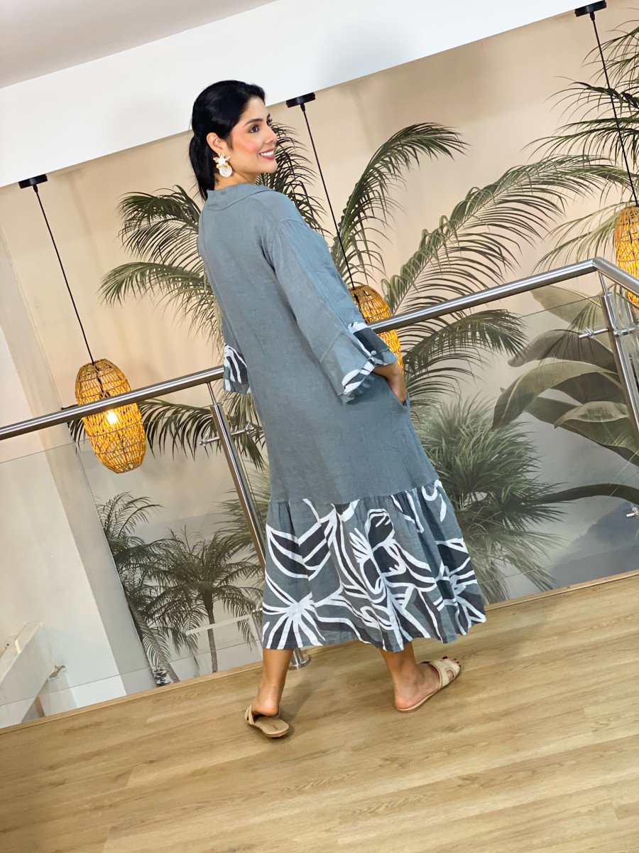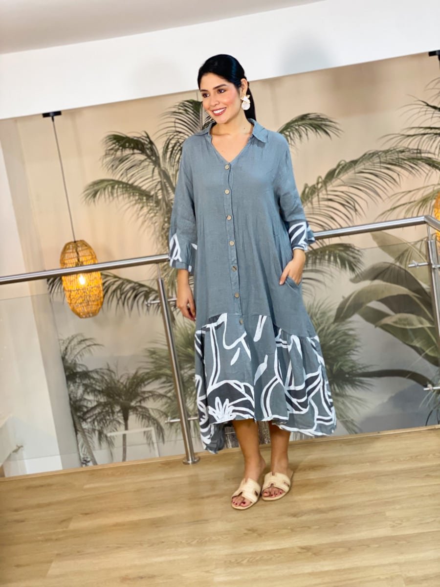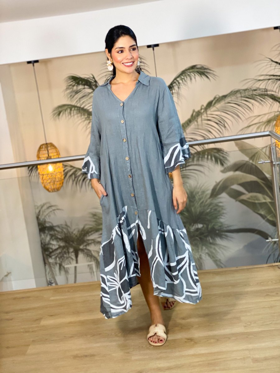 Vestido de lino talla única de silueta amplia con print de hojas en la parte inferior y en borde de manga.