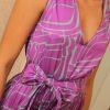Vestido largo con escote en v, manga sisa, cinturon que resalta tu cintura disponible en color violeta con print de lineas abstractas en color azul aguamarina. un vestido ideal para una ocasión especial.
